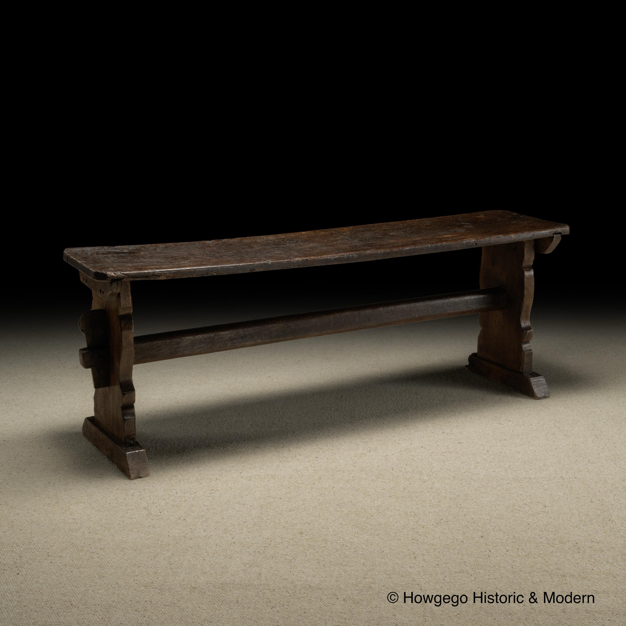 • It has a finely figured, single plank, thick, oak top. Supported by shaped-trestle ends joined by a central, pegged stretcher standing on trestle feet. In original condition. Excellent original colour and patina.