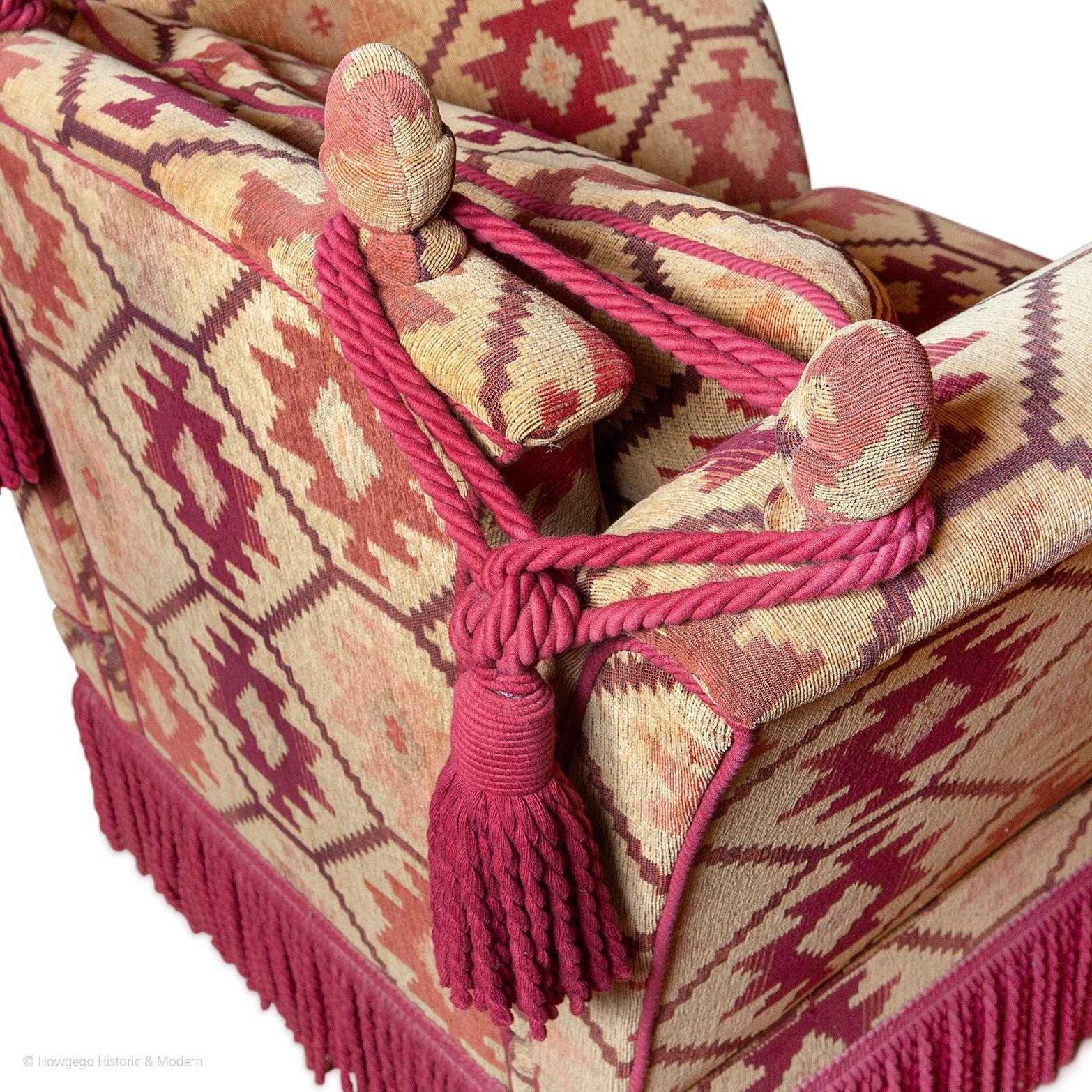 A Classic country house piece with the high back and wings creating a statement piece Really comfortable so the sitter sinks into it. The kelim textile has a Classic country house feel to it. The deep bullion fringe and tassel tie backs create a luxurious aesthetic. The high back and wings protect the sitter from draughts. The colors will harmonize with most interior schemes.