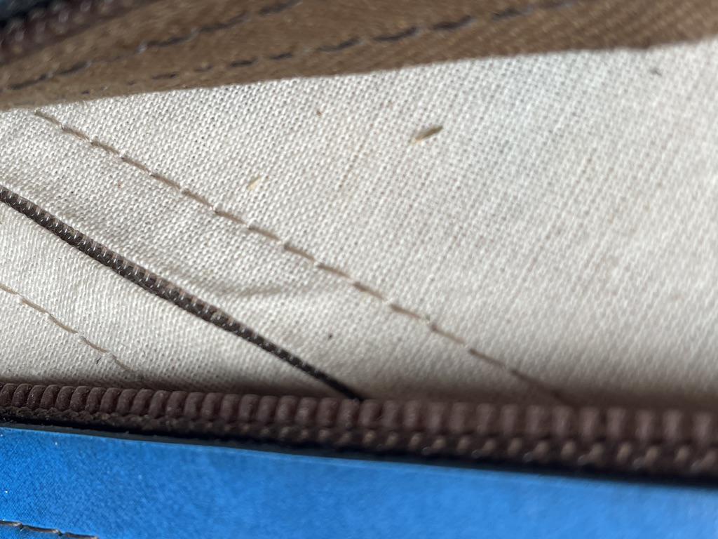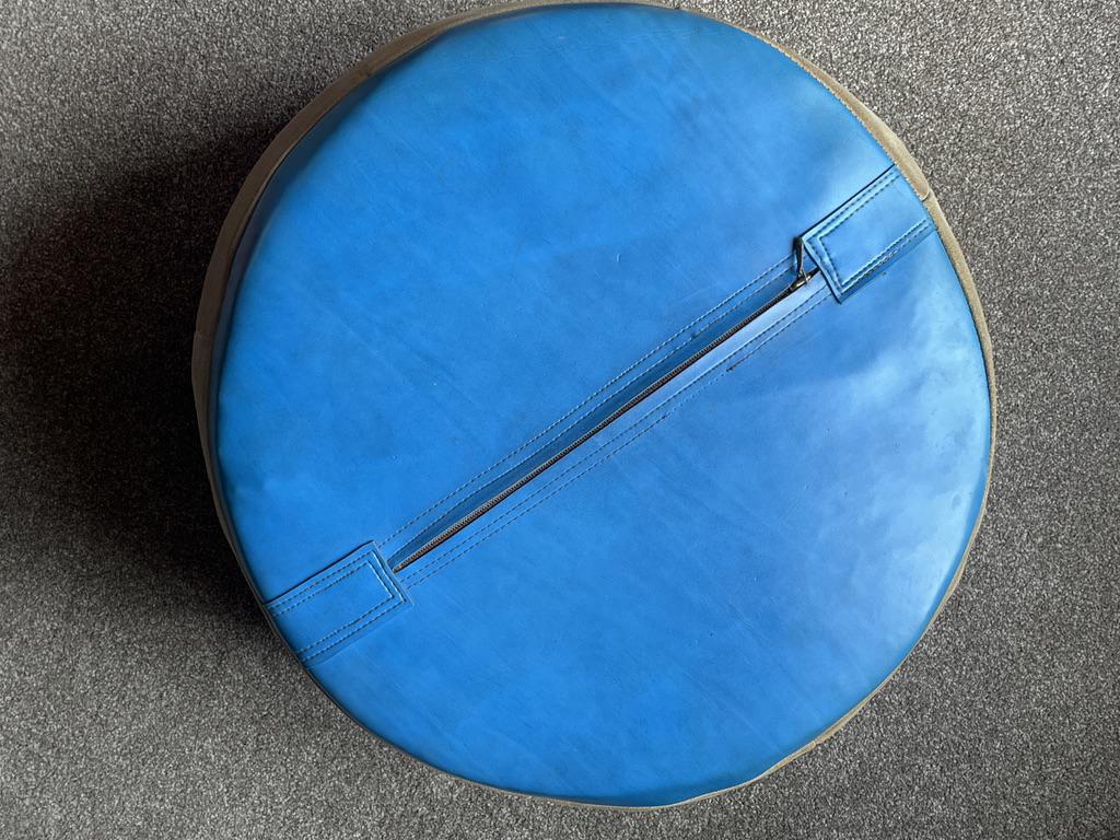 A vintage 1950s, pale, brown or beige, suede, small, 'barrel' pouffe. The top decorated with a stylized flower head with 8 petals. Blue vinyl base. Pale brown suede. Light marking commensurate with age.
